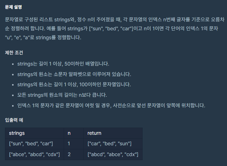 | function solution(strings, n) { return strings.sort((a,b) => a[n] === b[n] ? a.localeCompare(b) : a[n].localeCompare(b[n])) } |