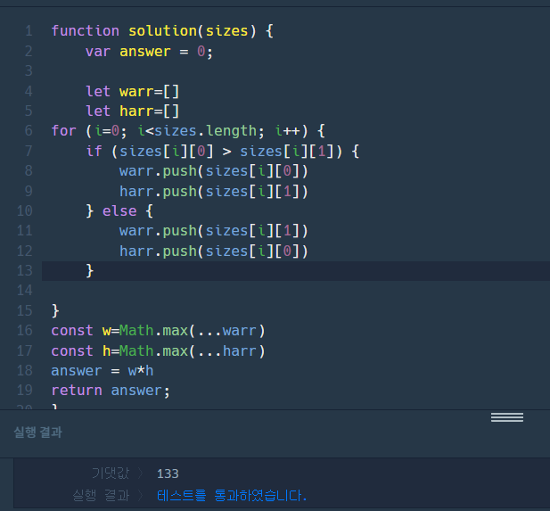 function solution(sizes) { var answer = 0; let warr=[] let harr=[] for (i=0; i<sizes.length; i++) { if (sizes[i][0] > sizes[i][1]) { warr.push(sizes[i][0]) harr.push(sizes[i][1]) } else { warr.push(sizes[i][1]) harr.push(sizes[i][0]) } } const w=Math.max(...warr) const h=Math.max(...harr) answer = w*h return answer; } |