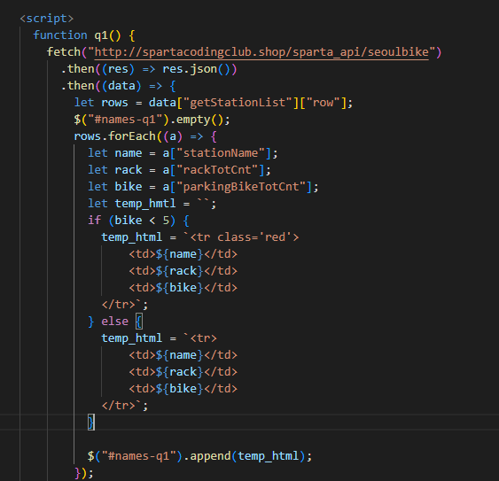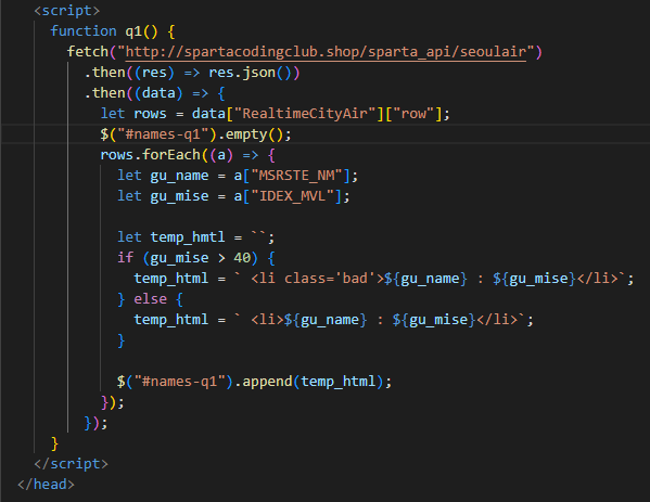 3) Fetch를 이용하여 서울미세먼지 OpenAPI를 받아온 예시