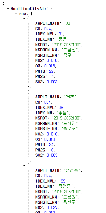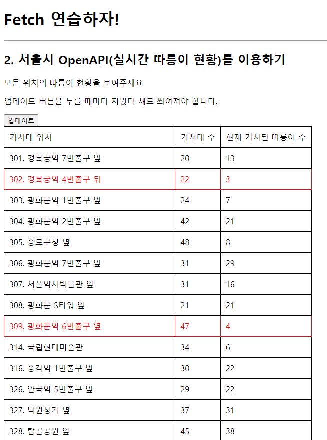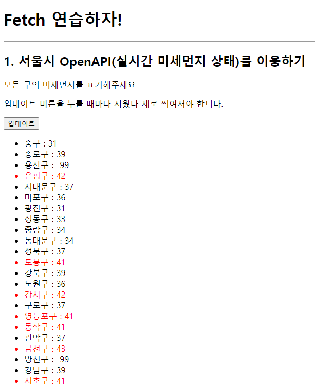3) Fetch를 이용하여 서울미세먼지 OpenAPI를 받아온 예시