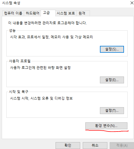 - 윈도우 검색을 통해 시스템 환경 변수 편집 실행