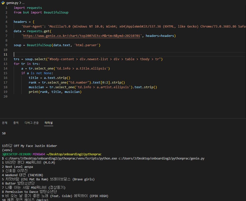 - requsts로요청, BeautifulSoup으로 솎아내기