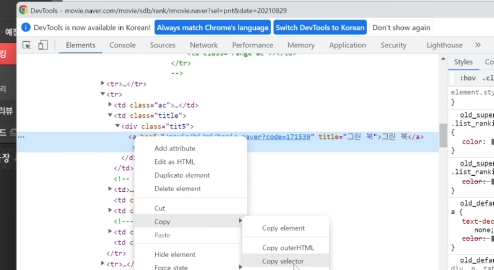 2-2. 검사 버튼을 통한 Copy selector