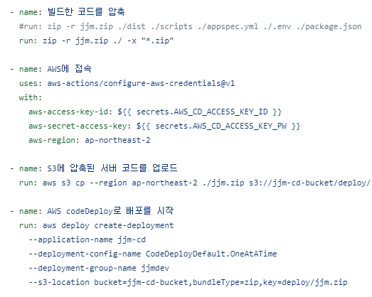 - cd빌드 명령어를 추가하였는데, zip부분에 필요한 디렉토리 스트럭쳐들의 경로를 추가하려니 양이 너무 많아서 전부 압축하는것으로 진행하였다
