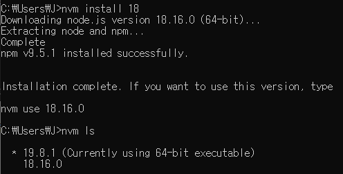 - nvm use (노드버전) : 사용할 node를 해당 버전으로 설정
