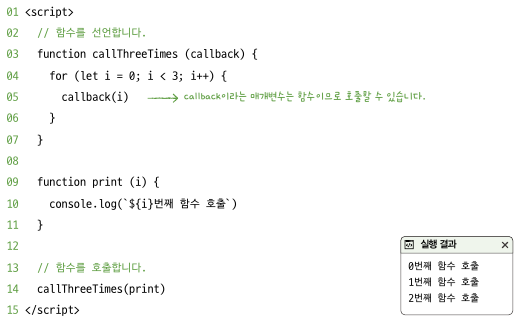1) 함수도 함수의 매개변수로 전달 가능, 이러한 것을 콜백함수로 명명